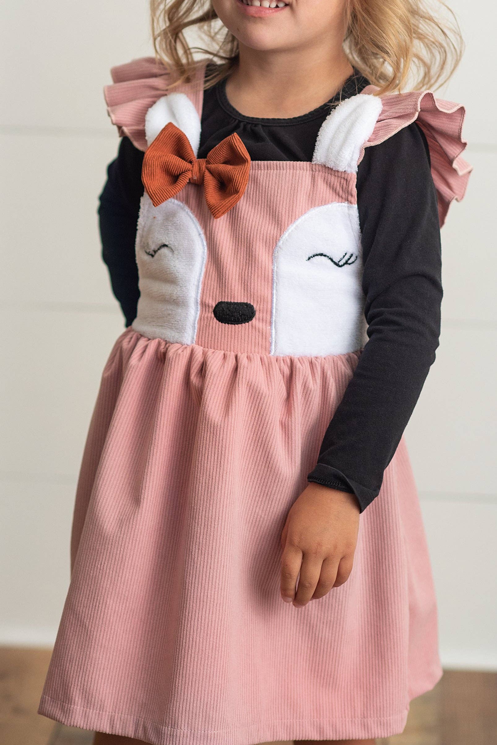 Oopsie Daisy - Kids Pink Corduroy Deer Ruffle Pinafore Jumper