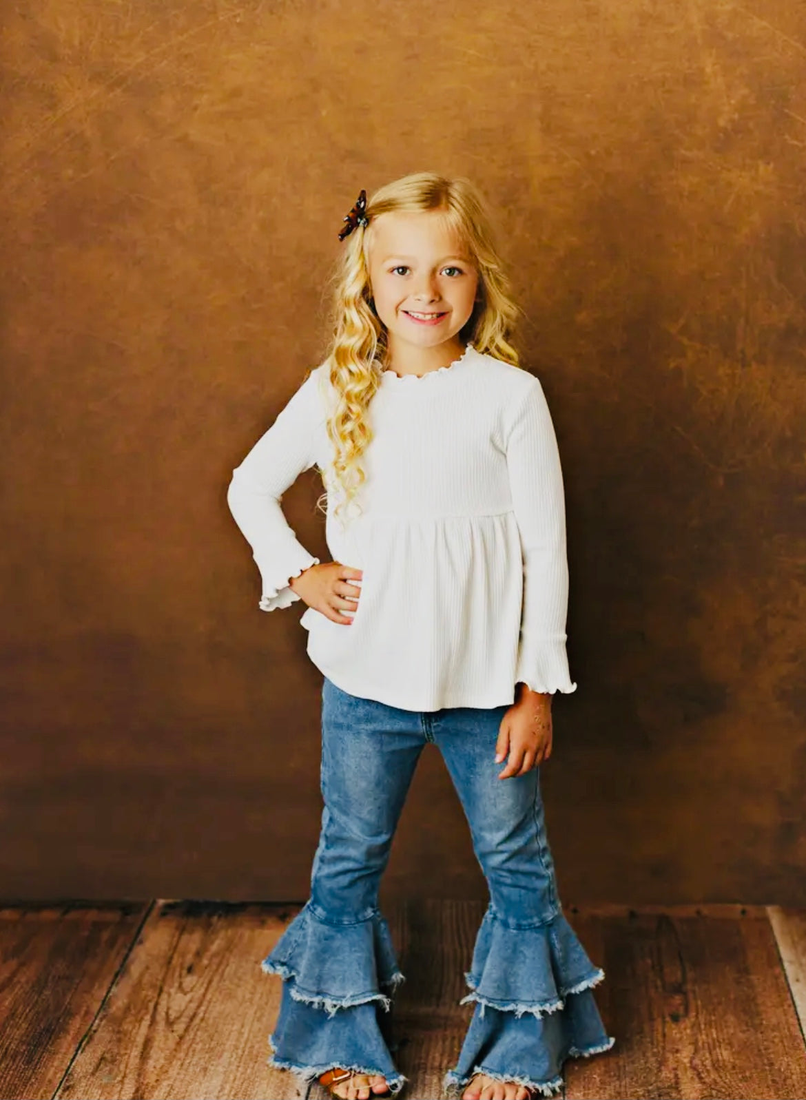 Kids White Long Sleeve Lettuce Trim Ribbed Shirt