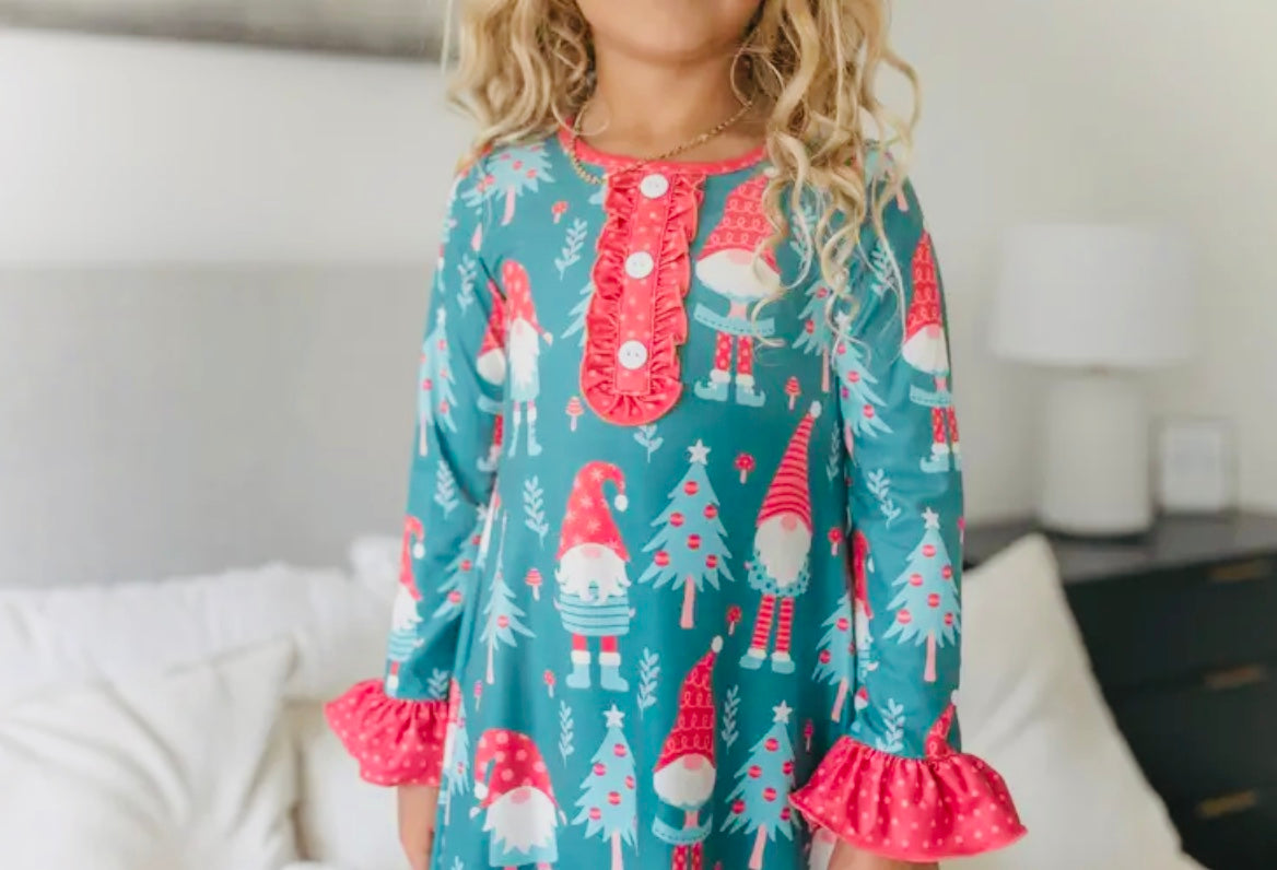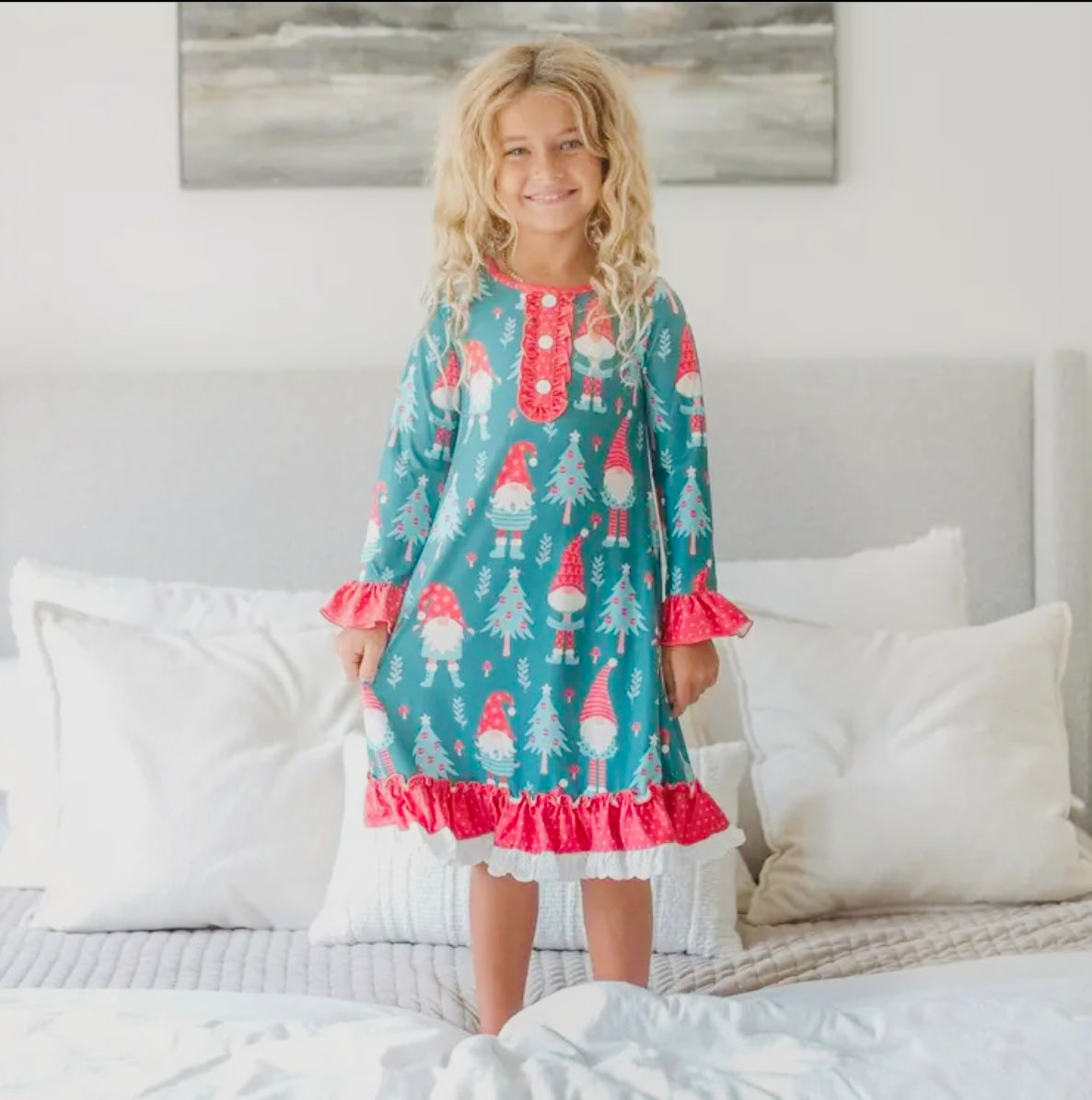 Kids Red Green Gnome Holiday Christmas Ruffle Lounge Gown