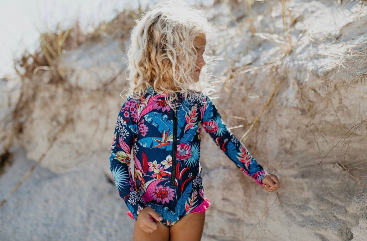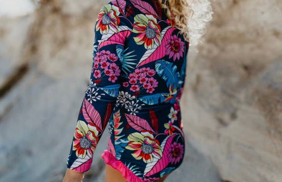 Blue and pink tropical floral one piece bathing suit